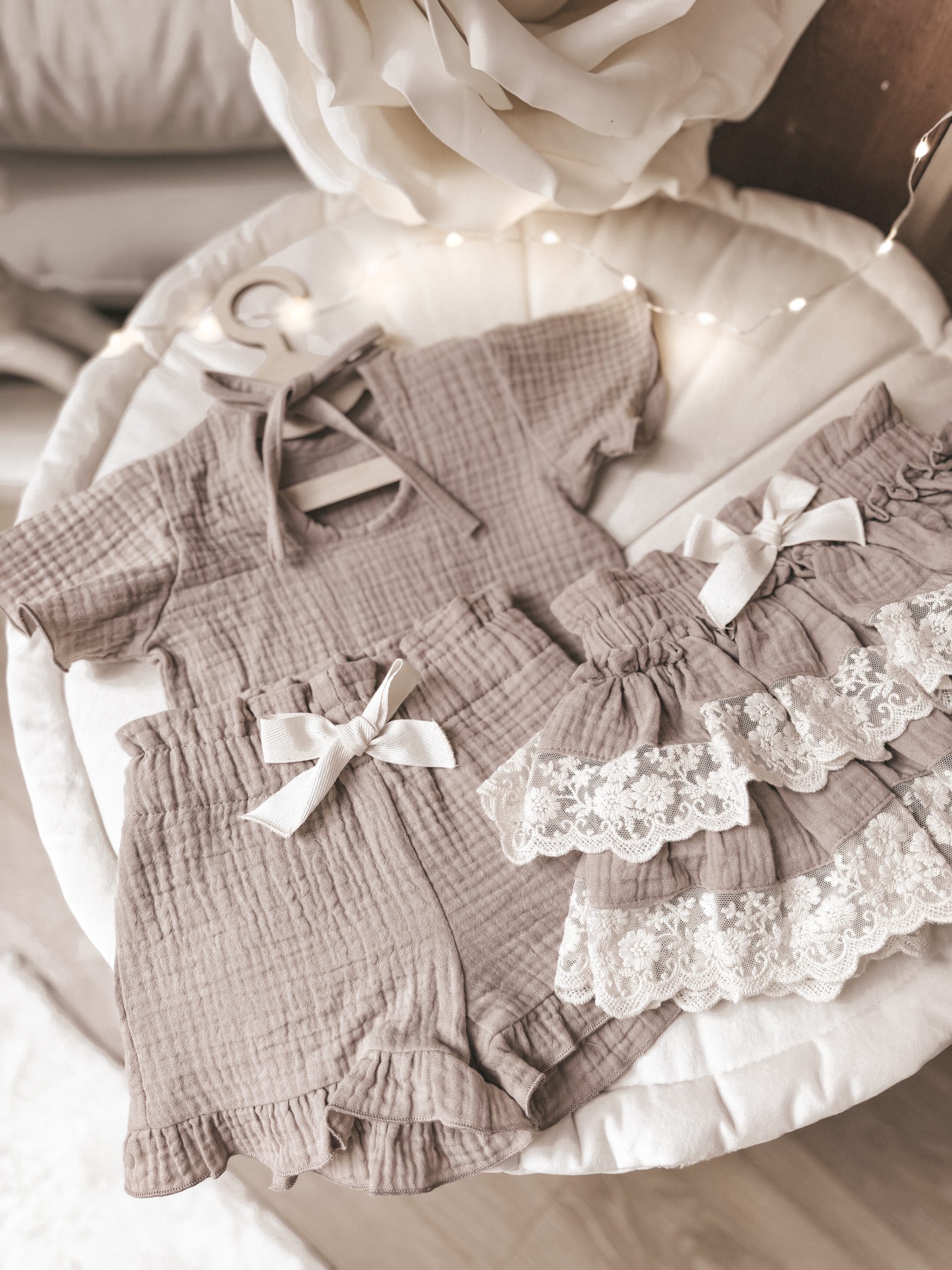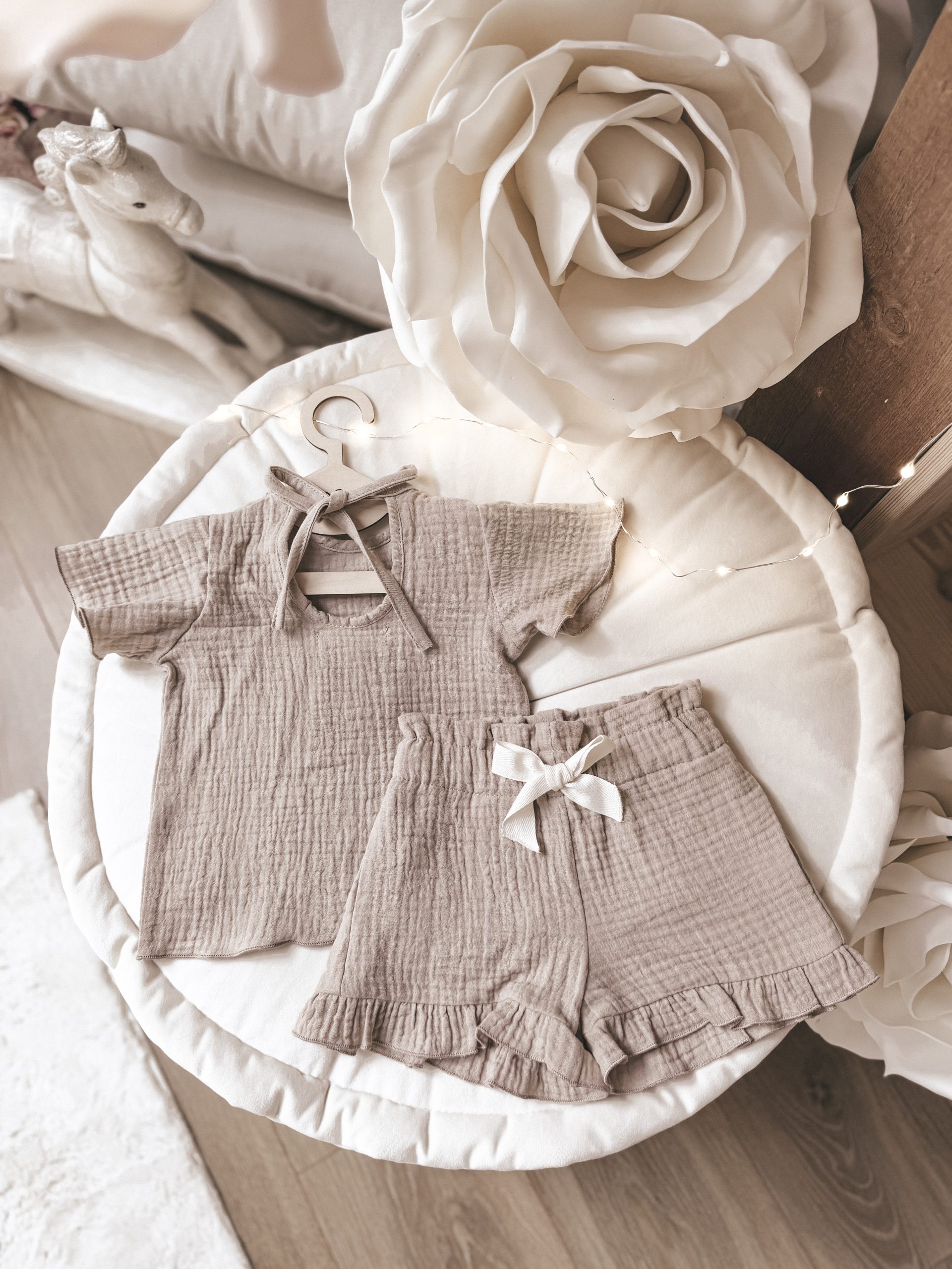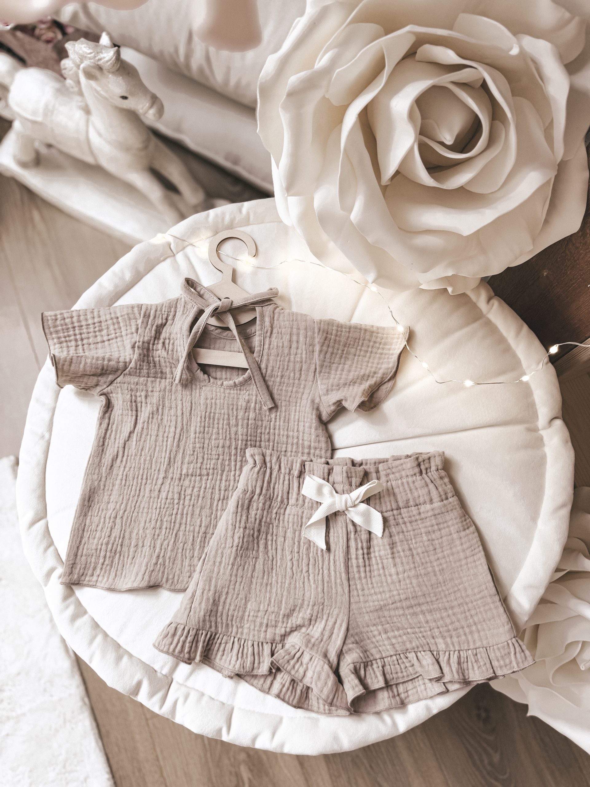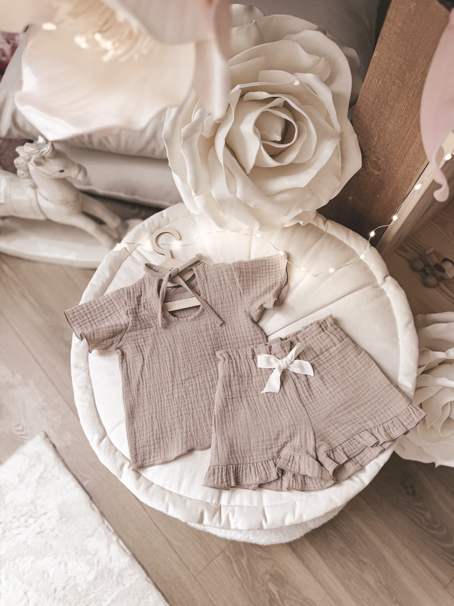 Limitowany drop – komplecik letni wykonany z przepięknej tkaniny muślin bawełniany w cudownym kolorze beżowym 💗