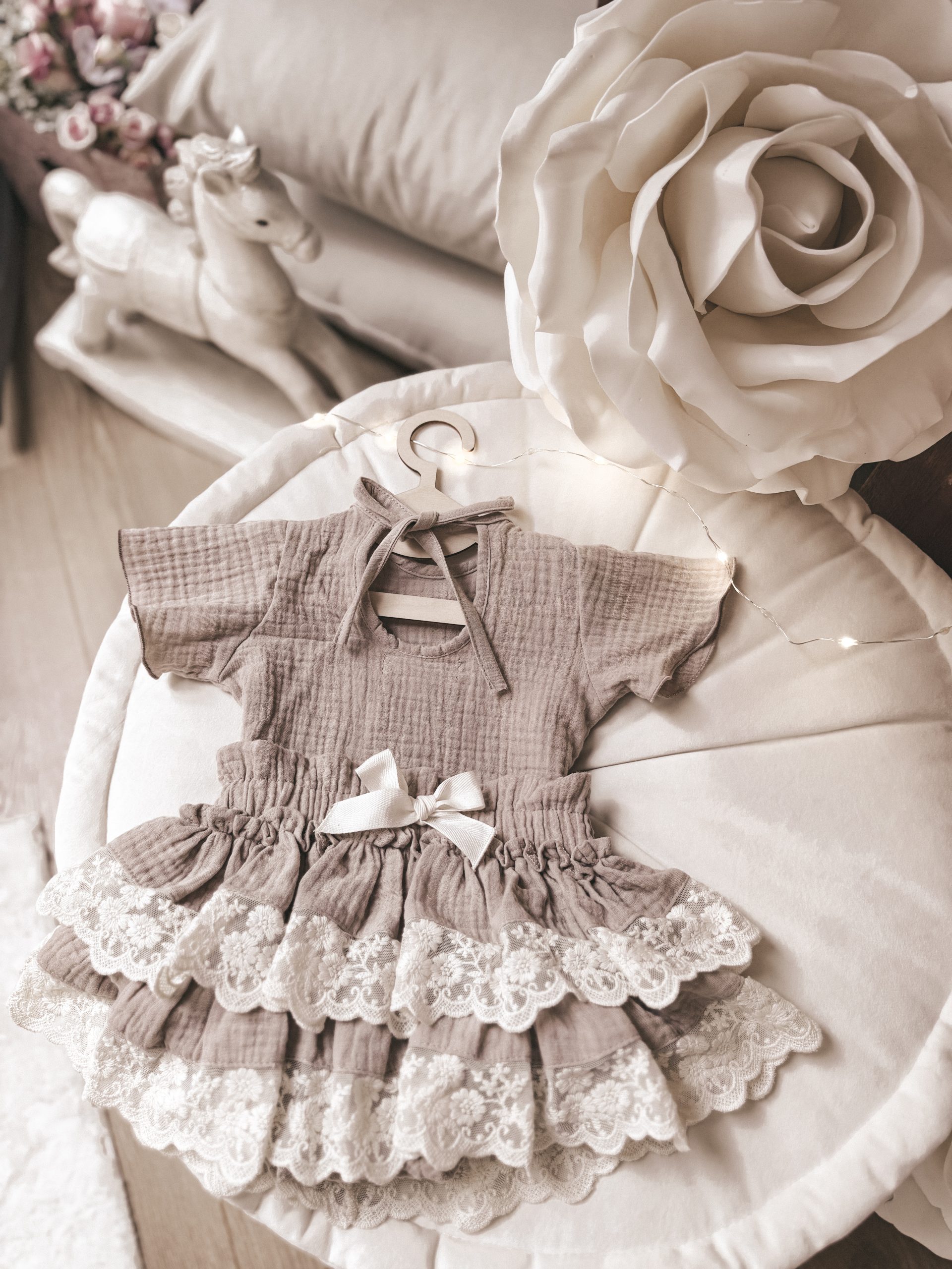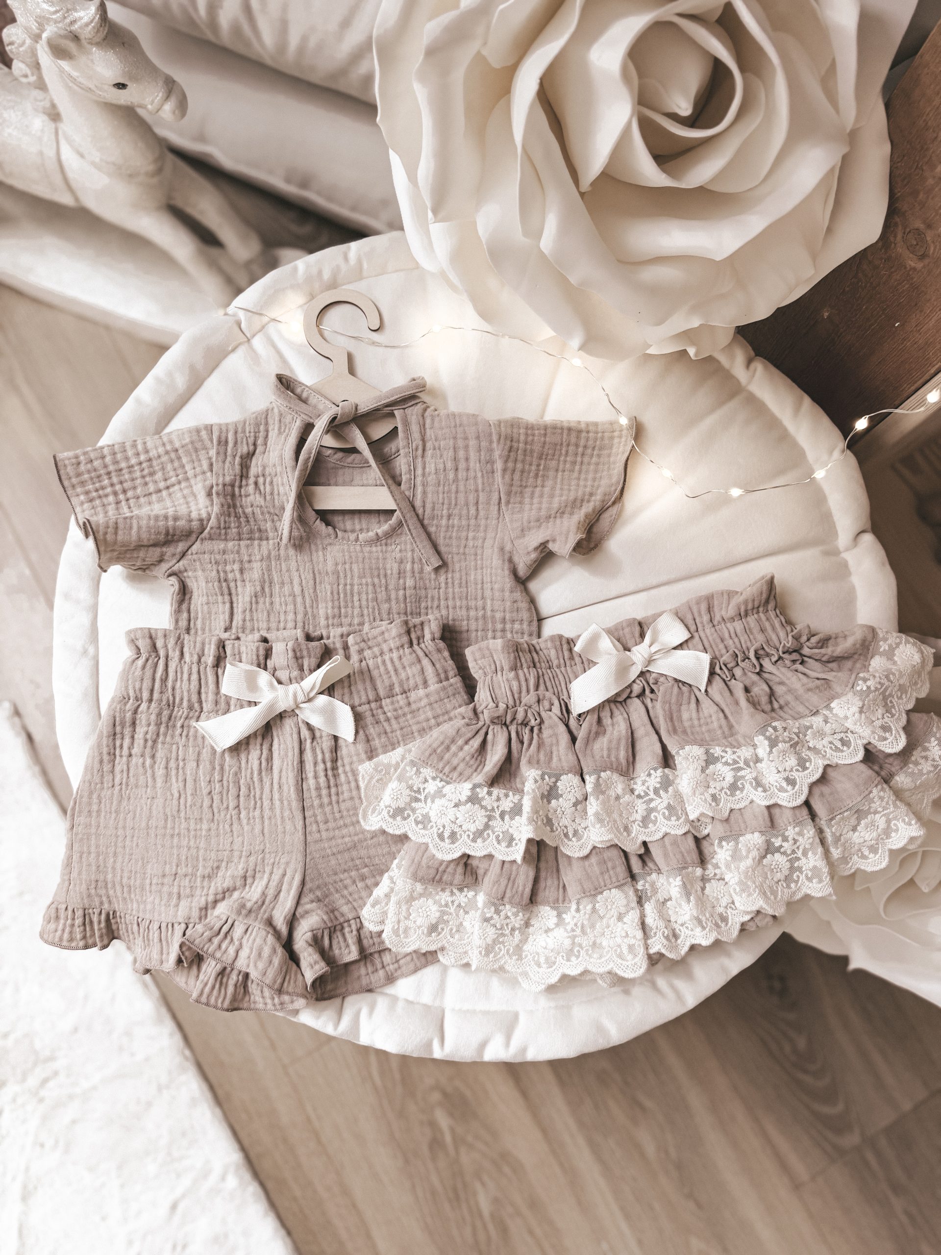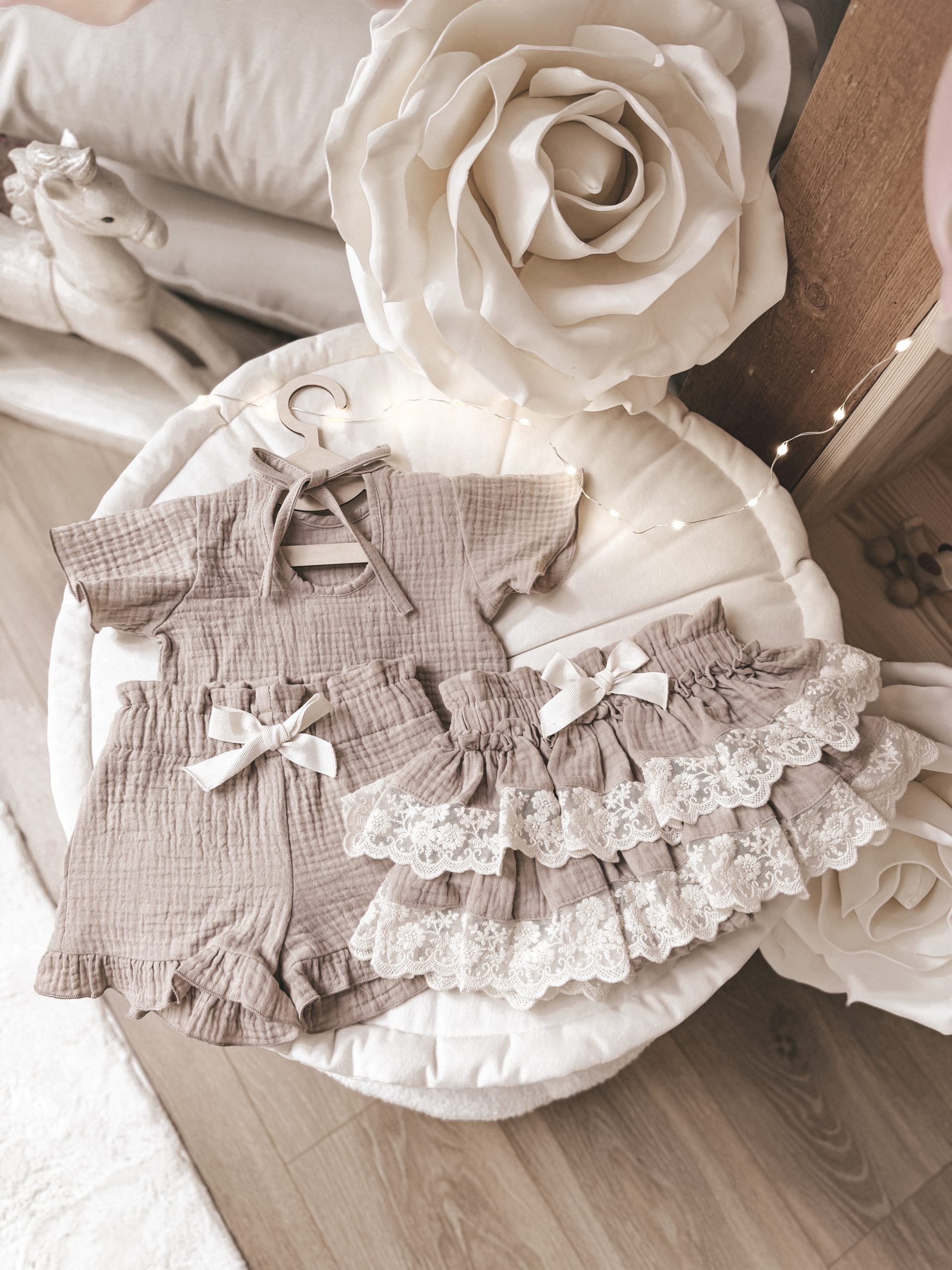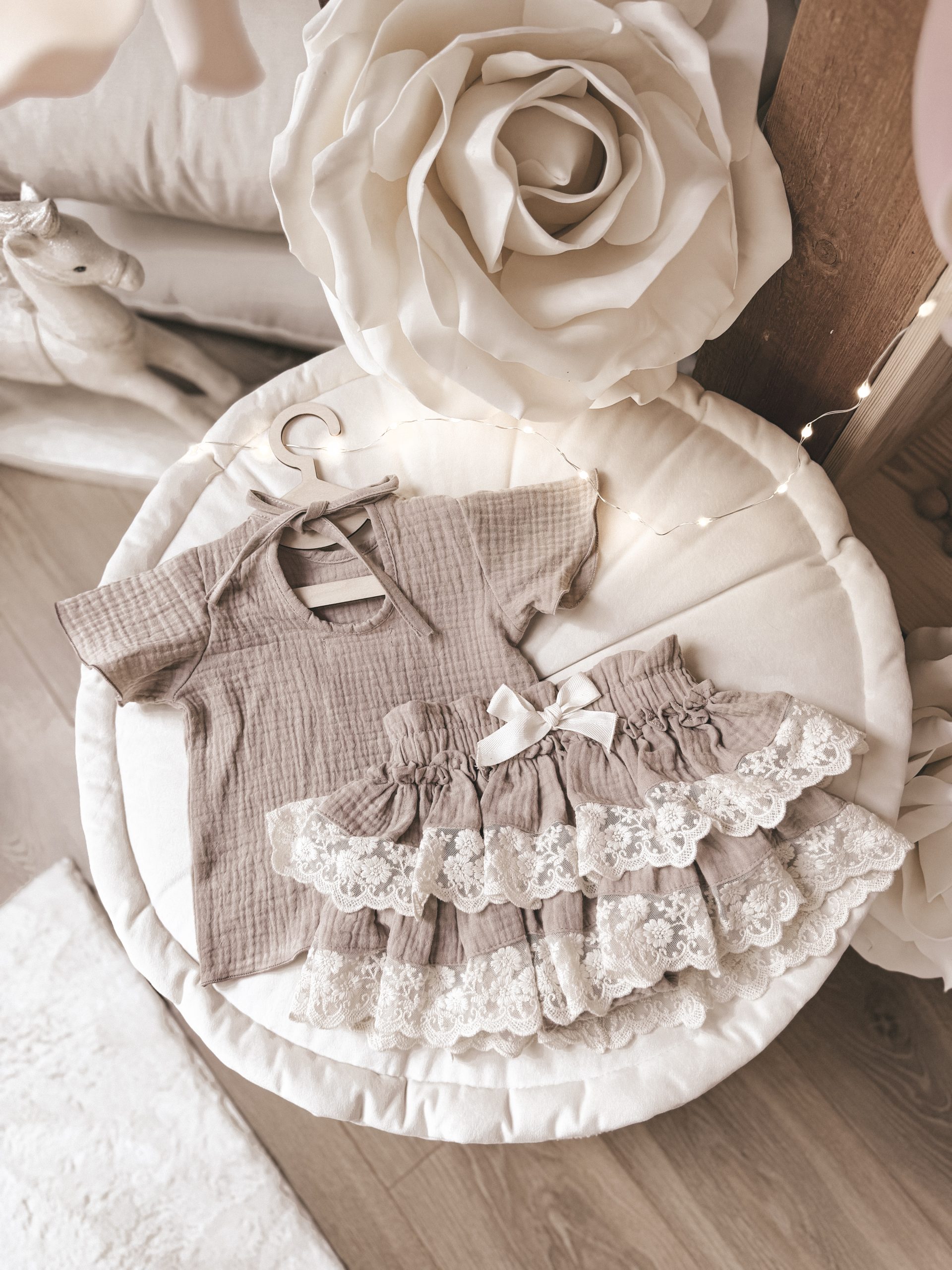 Limitowany drop – komplecik letni wykonany z przepięknej tkaniny muślin bawełniany w cudownym kolorze beżowym 💗
