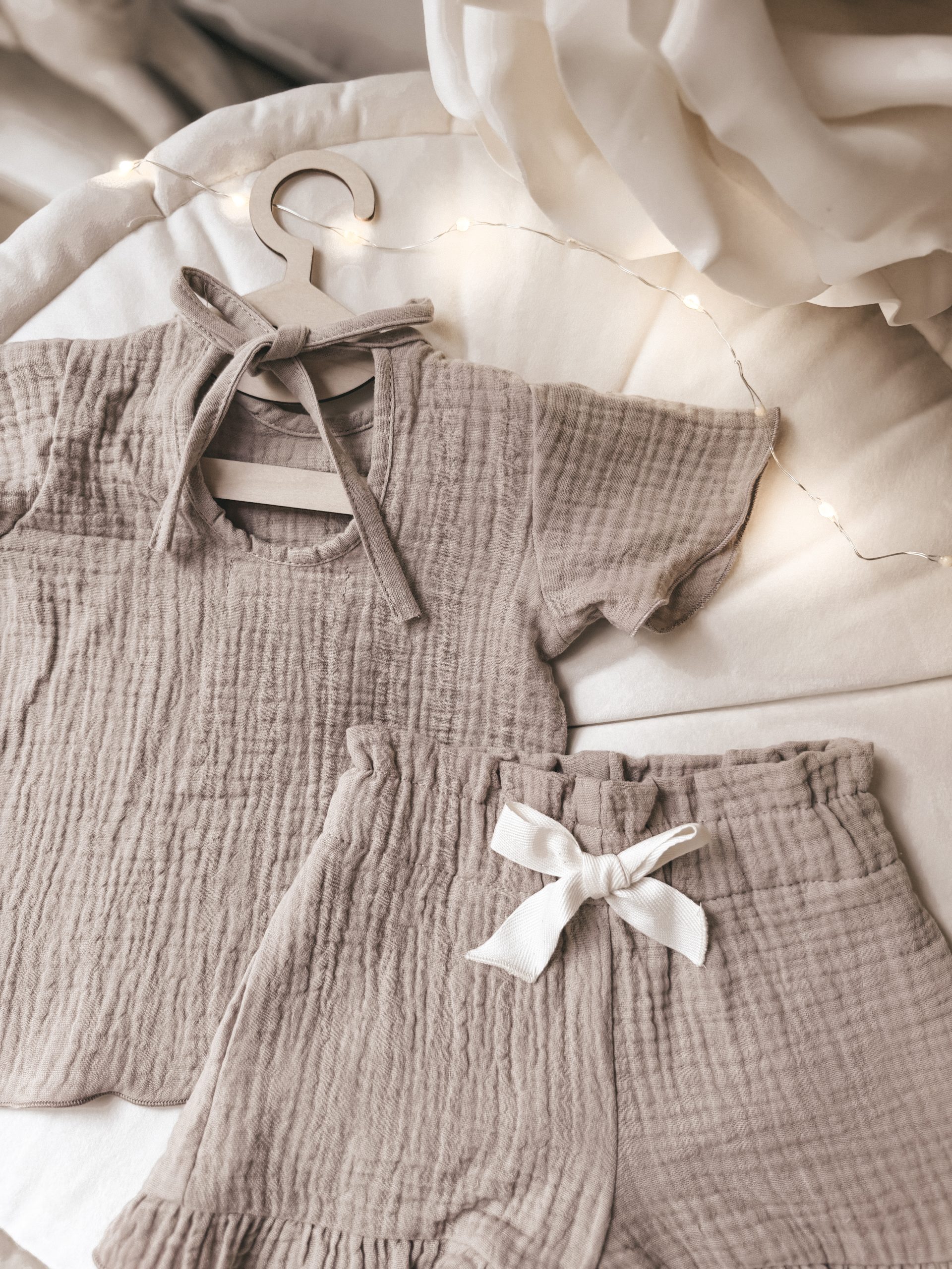 Krótkie spodnie i bluzka z materiałów bawełnianych przebadanych pod kątem maluszków, bezpiecznych, miękkich i oddychających. Muślin bawełniany to idealny materiał dla dzieci – jest wyjątkowo miękki, lekki i delikatny dla wrażliwej skóry. Dzięki swojej przewiewności pozwala skórze oddychać, co sprawia, że świetnie sprawdza się szczególnie latem. Naturalna bawełna jest bezpieczna, a przy tym trwała i z każdym praniem staje się jeszcze przyjemniejsza w dotyku. Dbamy o Wasze pociechy! ❤️