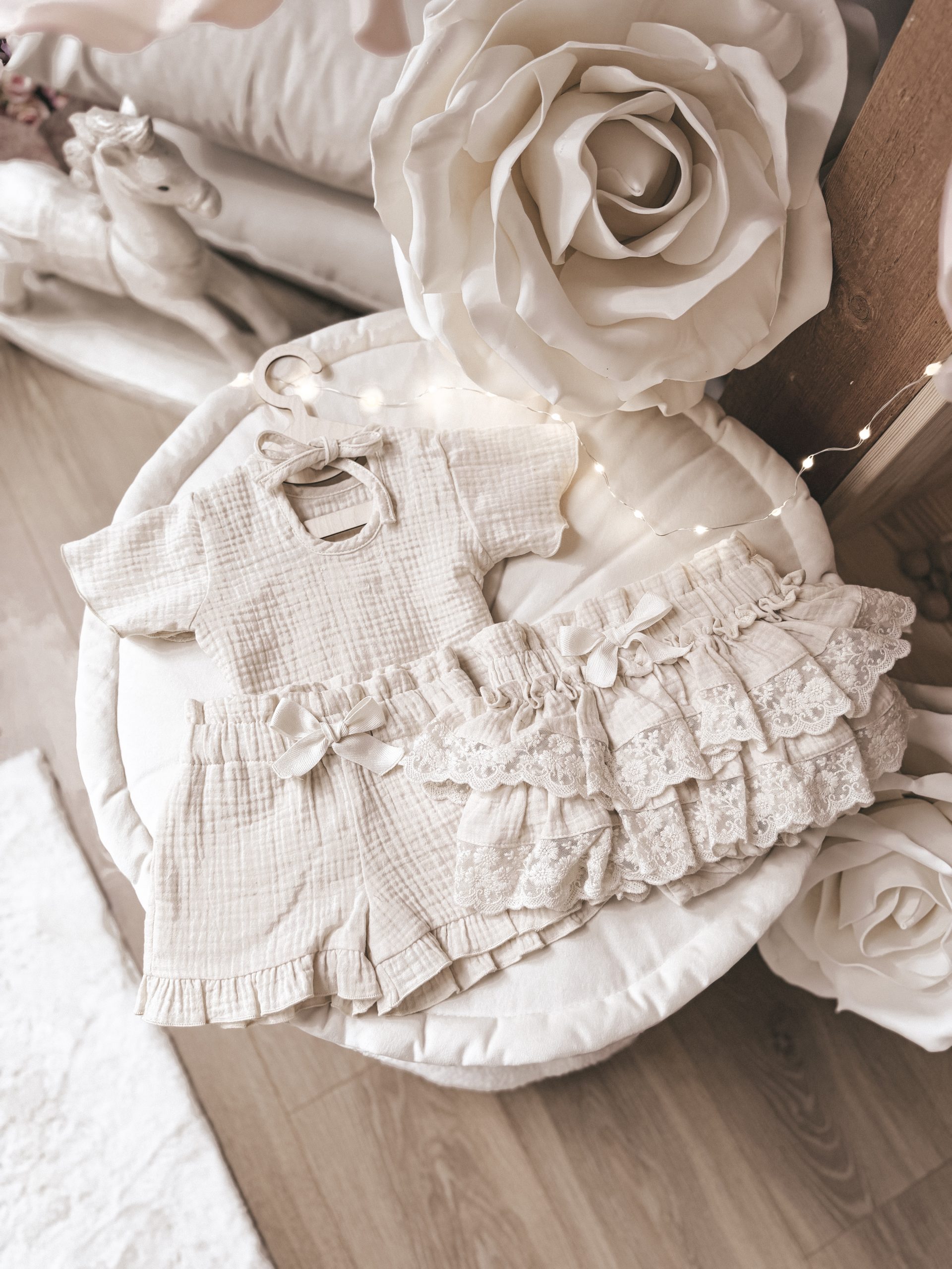 Każdy komplecik to bluzeczka z uroczym wiązaniem z tyłu. Spodenki z cudnymi falbaneczkami, prawdziwymi kieszonkami po bokach, a wszystko uszyte z największą starannością i wykończone Waszą ukochaną mereżką ♥️🥰